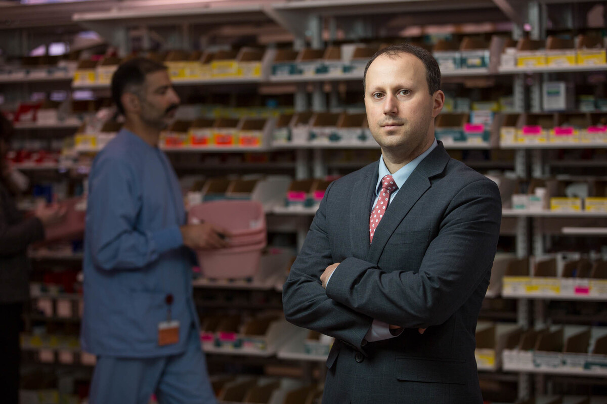 On a recent weekday, Berkowitz sorted through bins and boxes of medication in a back hallway of the hospital's pharmacy, peering at expiration dates. As the pharmacy's assistant director, he carefully manages how the facility orders and dispenses drugs to patients. Running a pharmacy is like working in a restaurant because everything is perishable, he says, "but without the free food."